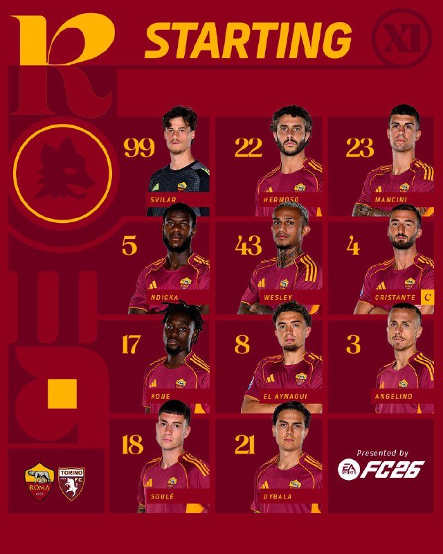 🚨🚨⚽️• تشكيلة نادي روما الرسمية لمواجهة تورينو.