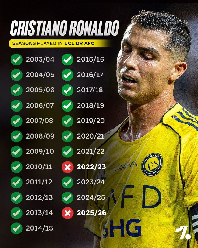 🚨🚨📊• إنهُ الموسم الثاني الذي لا يلعب فيه سيد البطولة و كبيرها ”كريستيانو رونالدو“ في دوري أبطال أوروبا ”أو“ دوري أبطال آسيا للنخبة.