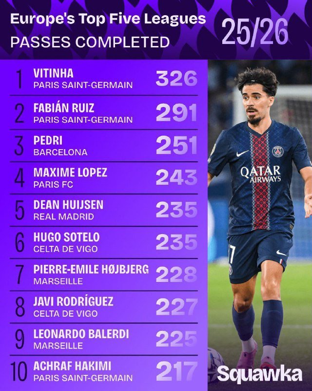 🚨🚨📊 فيتينيا هو اللاعب الوحيد الذي أكمل أكثر من 300 تمريرة في الدوريات الأوروبية الخمس الكبرى حتى الآن هذا الموسم.