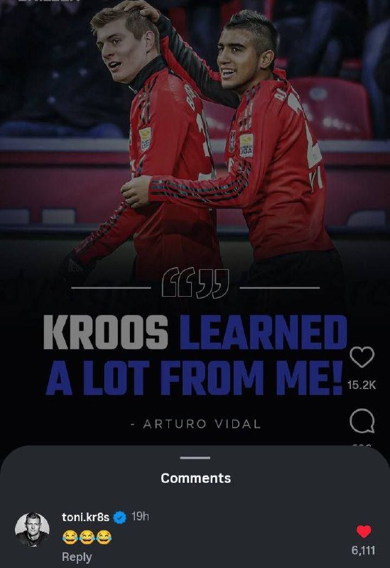 🗣 أرتورو فيدال : توني كروس تعلم الكثير مني، كان جيداً من الناحية الفنية، لكنه كان يفتقر إلى اللمسة الفنية، جاء إليّ وإلى ريناتو أوغوستو وشرحنا له ماهية كرة القدم، علمناه الكثير.