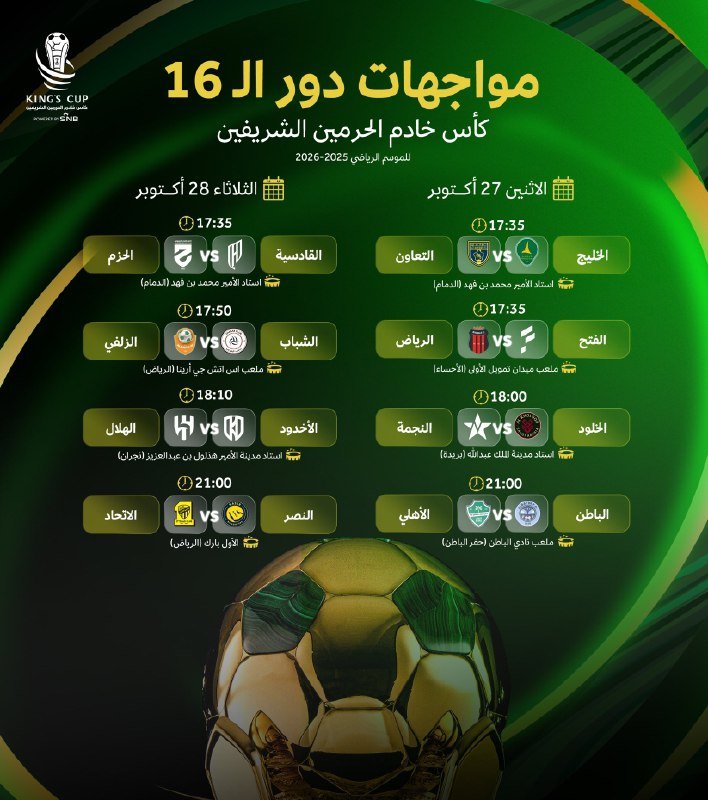 🚨🚨🚨🚨 رســـمـــيًـــا |تحديد موعد مواجهات دور الـ 16 من بطولة كأس الملك السعودي ، والتي ستلعب في يومي 27-28 اكتوبر. تصفّح المقالات • قائمة ريال مدريد المستدعاة لمواجهة كايرات الماتي….• قائمة برشلونة الرسمية المستدعاة لمواجهة ريال سوسيداد….