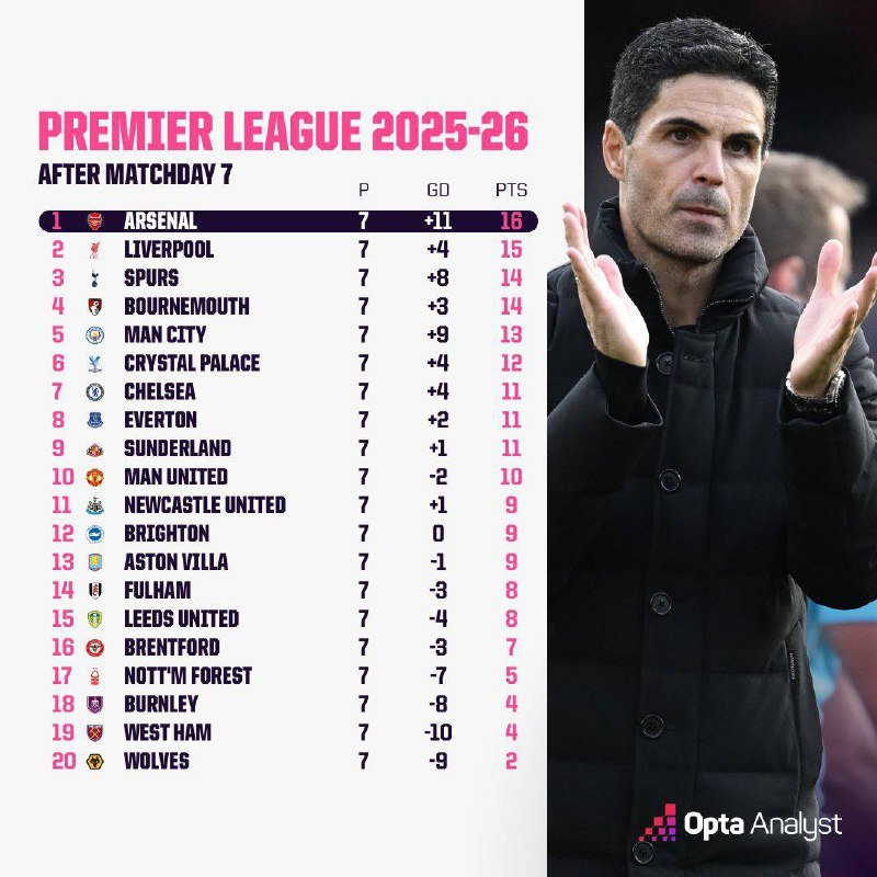 🚨🚨⚽️ — ترتيب البريميرليغ بعد نهاية الجولة السابعة.