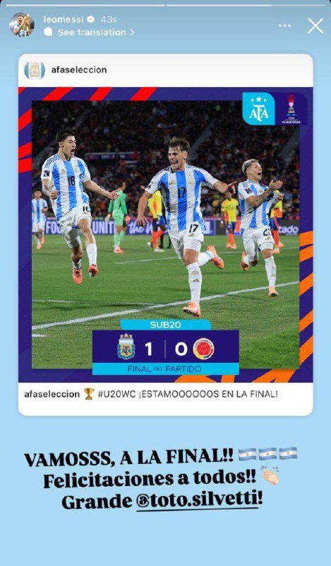 🏆🤩 • الأسطورة ليونيل ميسي يهنئ صعود المنتخب الأرجنتيني للشباب إلى النهائي عبرَ []:
