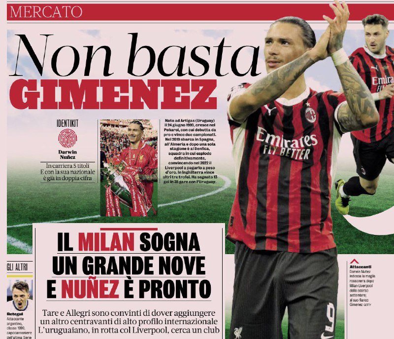 لاغازيتا |— ميلان يحلم بمهاجم رقم 9 كبير، ونونيز جاهز لتحقيق ذلك الحلم….