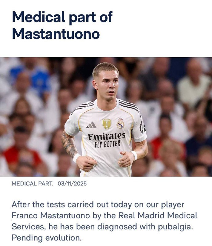 🚨🚨 — بيان رسمي من ريال مدريد : ⚽️بعد الفحوصات التي أجريت اليوم للاعبنا فرانكو ماستانتونو من قبل الخدمات الطبية لريال مدريد، شُخِّصت إصابته بآلام في العانة وسيتم متابعة تعافيه. تصفّح المقالات – ذا أثلتيك |— ترينت ألكسندر أرنولد لم يتعافَ تمامًا بعد، وما زال في خطة التعاف…رســـمـــيًّـــا |– كريستيانو رونالدو أفضل لاعب في الجولة السابعة من دوري روشن …
