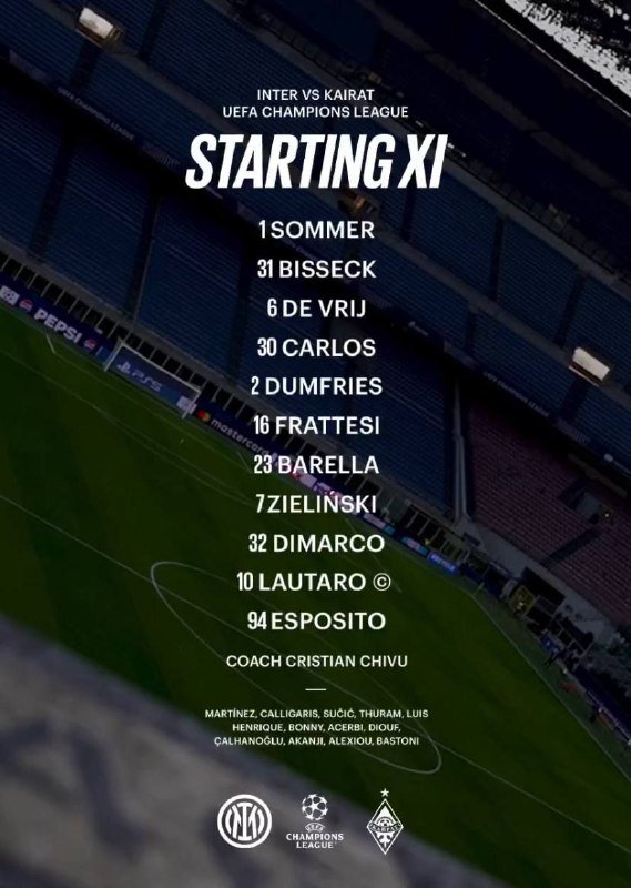 • تشكيلة إنتر الرسمية لمواجهة كايرات ألماتي…..