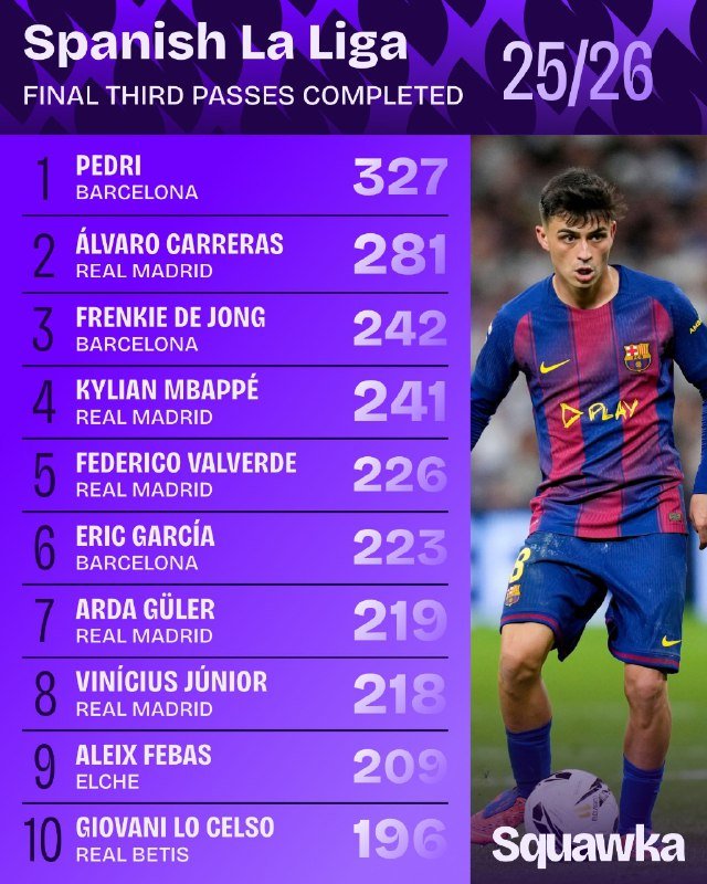 🚨🚨📊 | أكثر اللاعبين إكمالًا للتمريرات للثلث الأخير بالليغا حتى الآن.