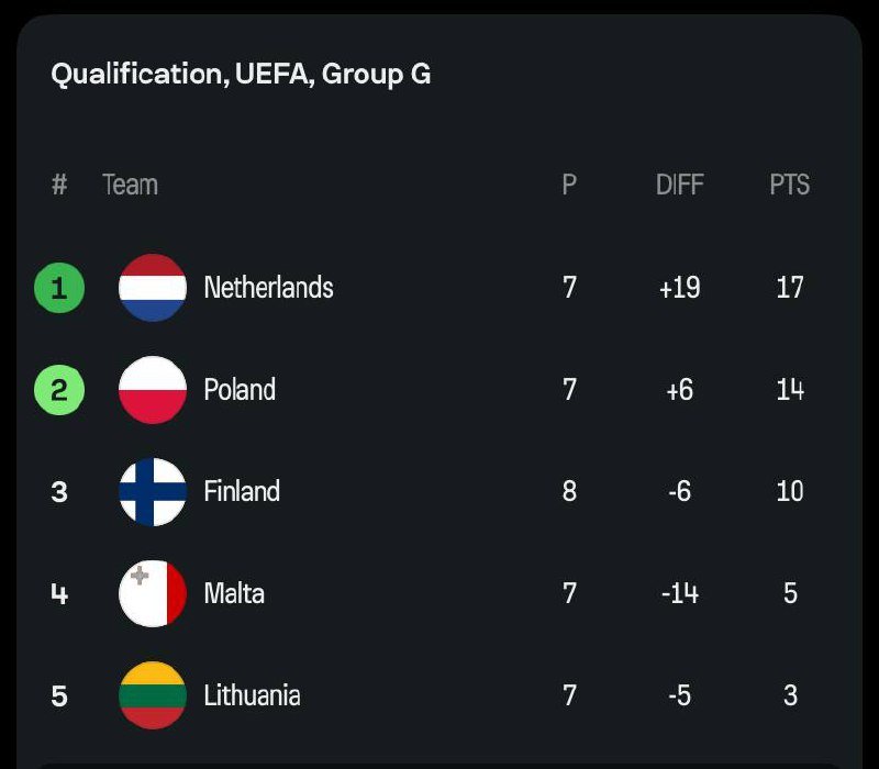 – الخسارة من ليتوانيا + فوز بولندا على مالطا بنتيجة أكثر من 13-0 لن تتأهل هولندا وستتأهل بولندا. أشياء مستحيل حدوثها لكن لا مستحيل في كرة القدم.