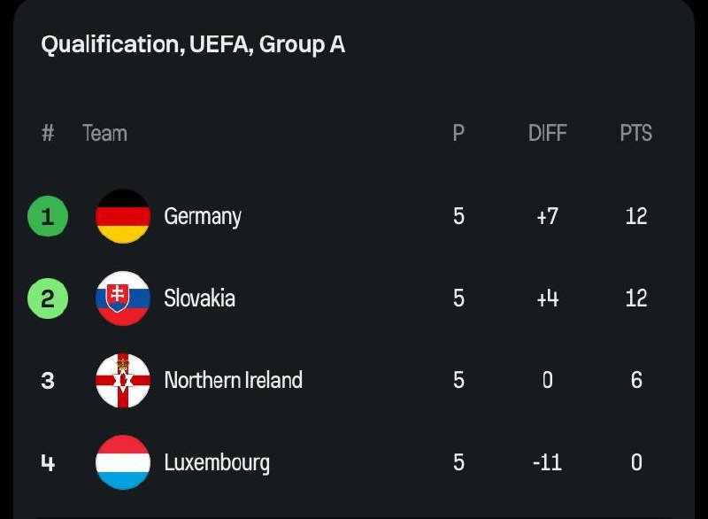 🚨🚨🇪🇺 | ترتيب المجموعة الأولى في تصفيات أوروبا لكأس العالم بعد نهاية الجولة الخامسة. – جنون ما يحدث في هذه المجموعة! المواجهة الأخيرة بين ألمانيا وسلوفاكيا ستحسم من سيتأهل للمونديال مباشرةً. – ألمانيا تتفوق بفارق الأهداف، على سلوفاكيا الفوز فقط للتأهل.