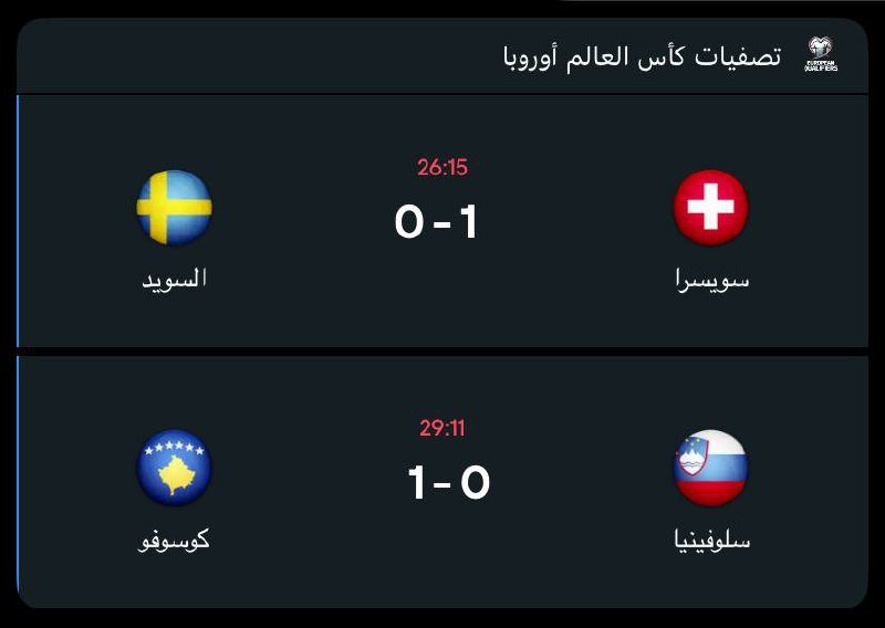 🚨🚨🇪🇺| سويسرا تحتاج أيضًا لتعثر كوسوفو لحسم التأهل، التي متقدمة بهدف على سلوفينيا حتى الآن. 🚨🚨🇪🇺| النمسا تفوز على قبرص بهدفين دون رد سجلهما ماركو أرناوتوفيتش، لتعزّز آمالها في التأهل إلى المونديال. تعثر منتخب البوسنة والهرسك بعد قليل = تأهل النمسا. تصفّح المقالات سبورت | قضية زيارة ميسي للكامب نو لم تغلق بعد، لم تفتح بداعي الكراهية ولكن برشل…لويس دي لا فوينتي : هاوسن يعاني من انزعاج طفيف، وكما نقول دائماً، أولويتنا هي ا…