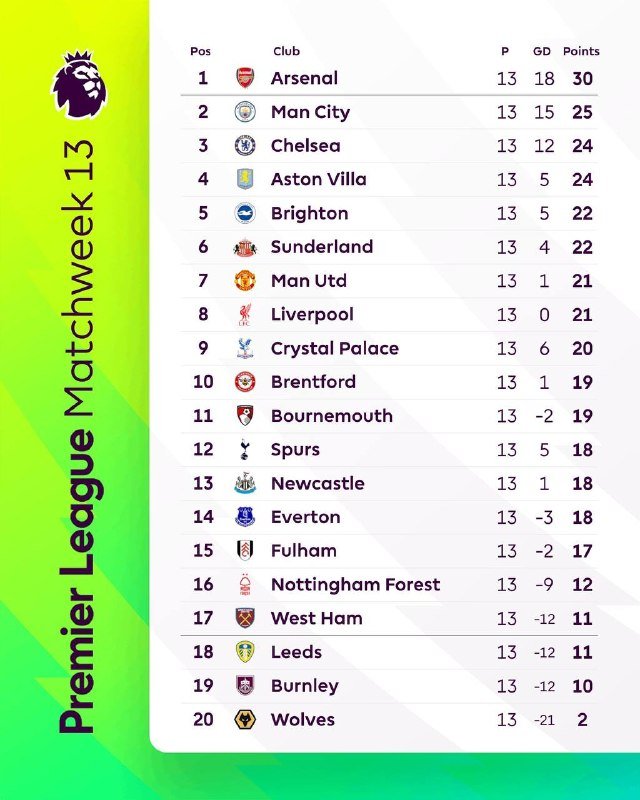 🚨🚨⚽️ — ترتيب البريميرليغ بعد نهاية الجولة الثالثة عشرة.
