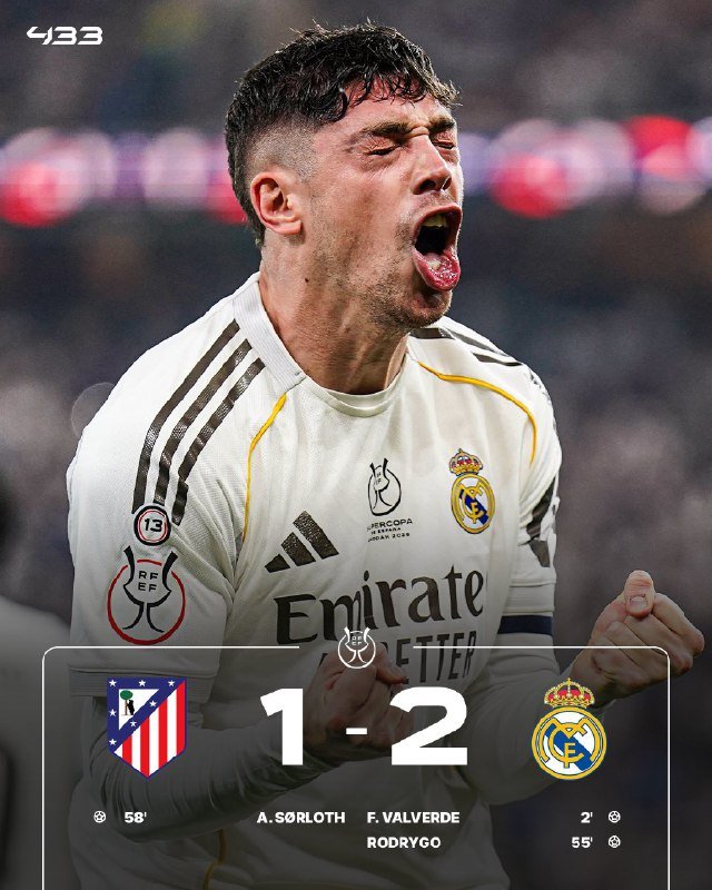 ⚽️⚽️ | انتهت القمة، ريال مدريد إلى النهائي. 📮⚽️ | نهاية المُباراة [كأس السوبر الإسباني – نصف النهائي]: • [⚽️] ريال مدريد 2-1 أتلتيكو مدريد [⚽️] 🇺🇾⚽️ فيديريكو فالفيردي. 🇧🇷⚽️ رودريغو 🅰️ فيدريكو فالفيردي. 🤩⚽️ ألكسندر سورلوث 🅰️ جوليانو سيميوني. تصفّح المقالات رســـمـــيًّـــا | نهائي كأس السوبر الإسباني 2027/2026 ريال مدريد برشلونة الج…الونسو تجاهل سيميوني ولم يصافحة ، توجه مباشرةً للنفق….