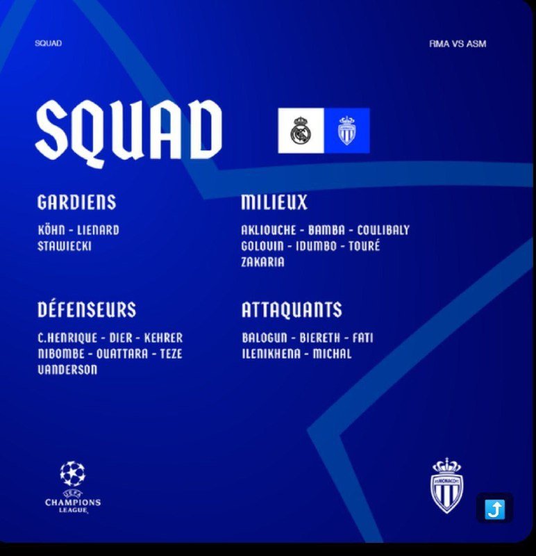 🚨⚽️ • قائمة نادي موناكو الفرنسي المستدعاة لمواجهة ريال مدريد.