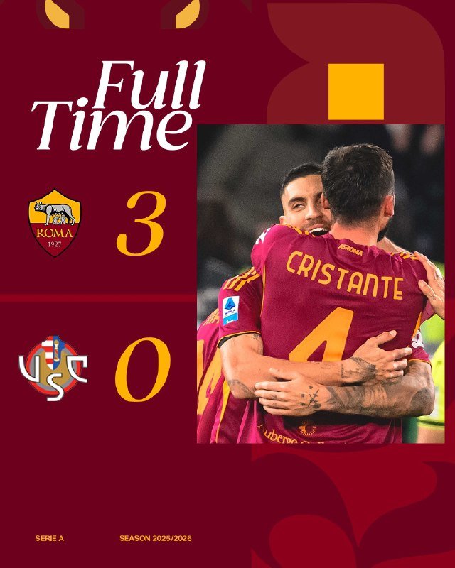 🚨⚽️ | نهاية المُباراة [الدوري الإيطالي – الجولة السادسة والعشرون]: • [⚽️] روما 3-0 كريمونيزي [⚽️] 🟠⚽️ بريان كريستانتي 🅰️ لورينزو بيليغريني. 🟠⚽️ إيفان نديكا 🅰️ بريان كريستانتي. 🤩⚽️ نيكولو بيسيلي.