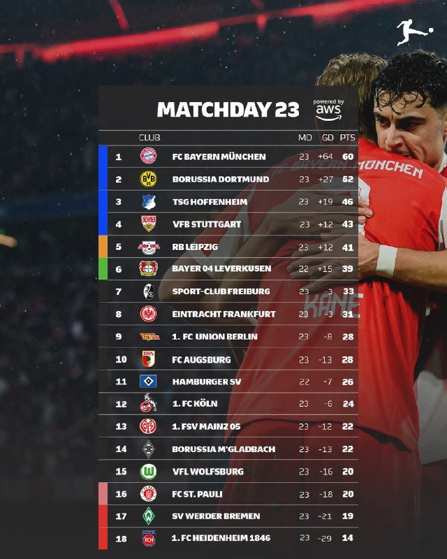 🚨🚨⚽️ — ترتيب البوندسليغا بعد نهاية الجولة الـ 23.