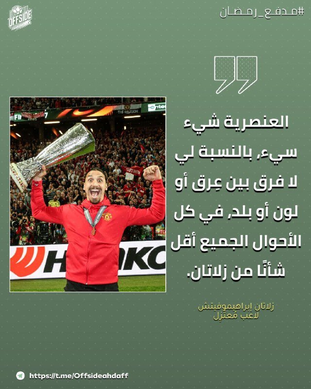🔔⚽ | #مدفع_رمضان“العنصرية شيء سيء، بالنسبة لي لا فرق بين عِرق أو لون أو بلد، في كل الأحوال الجميع أقل شأنًا من زلاتان.”زلاتان إبراهيموفيتش في تصريح يمتدح نفسه. تصفّح المقالات أربيلوا []:”كلمات لابورتا؟ لا أخوض في تقييم كلمات لابورتا. بالنسبة لي، أكبر فضي…– إذا لعب بريستياني، هل سترفض مصافحته؟ تيبو كورتوا []: “هذا أمر لم نناقشه نحن ا…