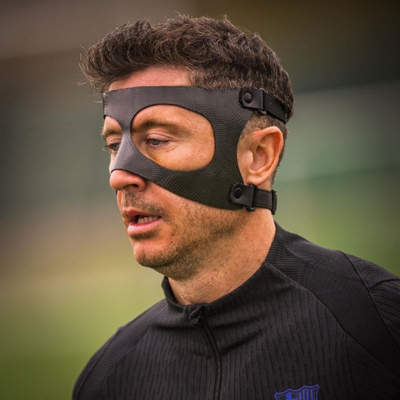 • روبرت ليفاندوفسكي تدرب مرتديًا قناعًا واقيًا خلال حصة برشلونة اليوم بعد إصابته الأخيرة.