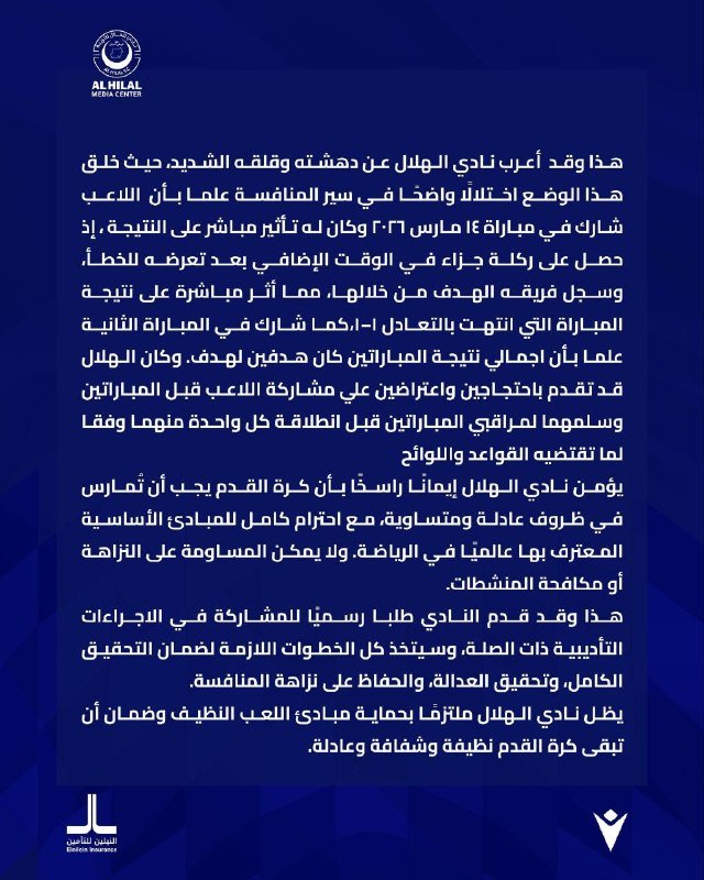 قدم الهلال الشكوى بعد مشاركة اللاعب رغم صدور قرار سابق بإيقافه بسبب مخالفة تتعلق بالمنشطات.