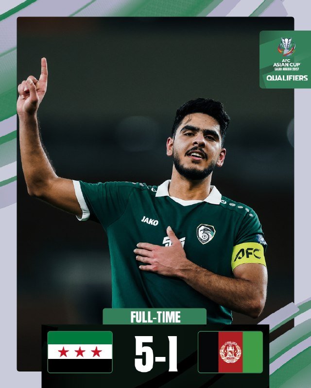 سوريا تحقق العلامة الكاملة في تصفيات كأس آسيا 2027 بعد فوزها على أفغانستان 5-1 في الجولة السادسة الأخيرة من دور المجموعات.