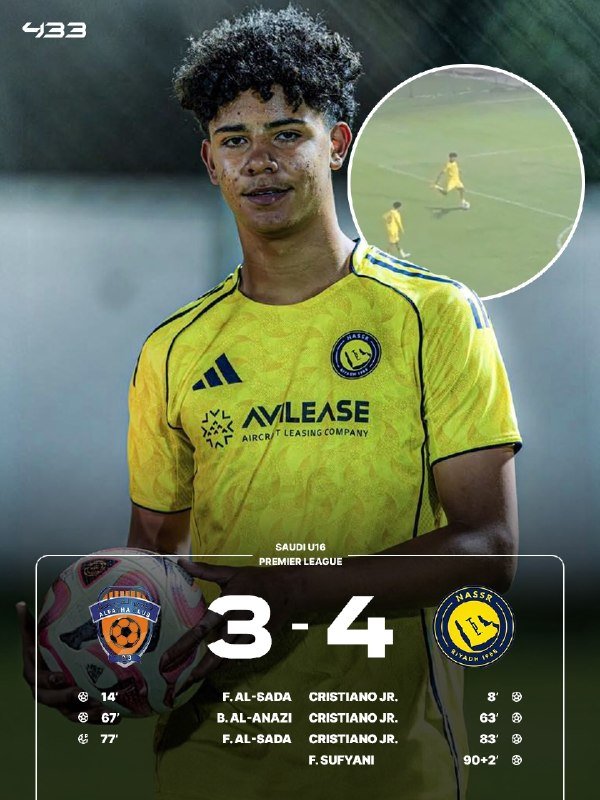 — كريستيانو رونالدو جونيور يسجل هاتريك ضد الفيحاء في دوري روشن السعودي للشباب يوم أمس، هدف من ركلة حرة، هدفان من لعب مفتوح.