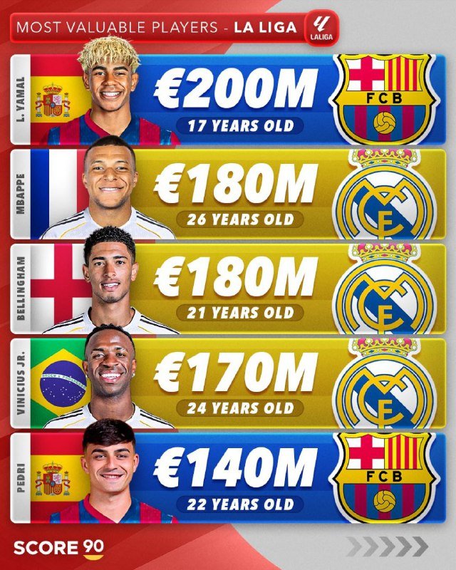🚨📊 • اللاعبون الأغلى قيمة سوقية في الدوري الإسباني وفقاً لـ Score90 ✅. تصفّح المقالات إيدو أغيري (التشرينغيتو) : “اليوم، لا يوجد مجال للمقارنة مع مبابي، لا مقارنة م…• اللاعبون الأغلى قيمة سوقية في الدوري الألماني وفقاً لـ Score90 ….