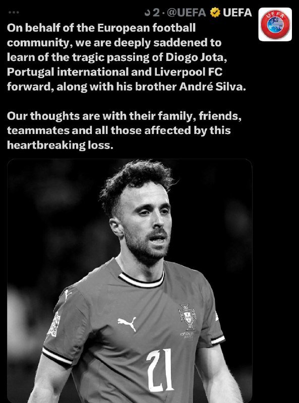 – باسم مجتمع كرة القدم الأوروبية، نعبر عن بالغ حزننا وصدمتنا عقب الأنباء المأساوية حول وفاة ديوغو جوتا، النجم البرتغالي ومهاجم نادي ليفربول، وشقيقه أندريه سيلفا.