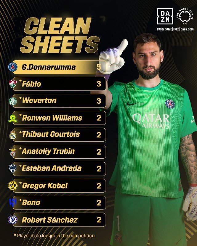 • أكثر الحراس حفاظًا على شباك نظيفة في كأس العالم للأندية حتى الآن. – دوناروما…