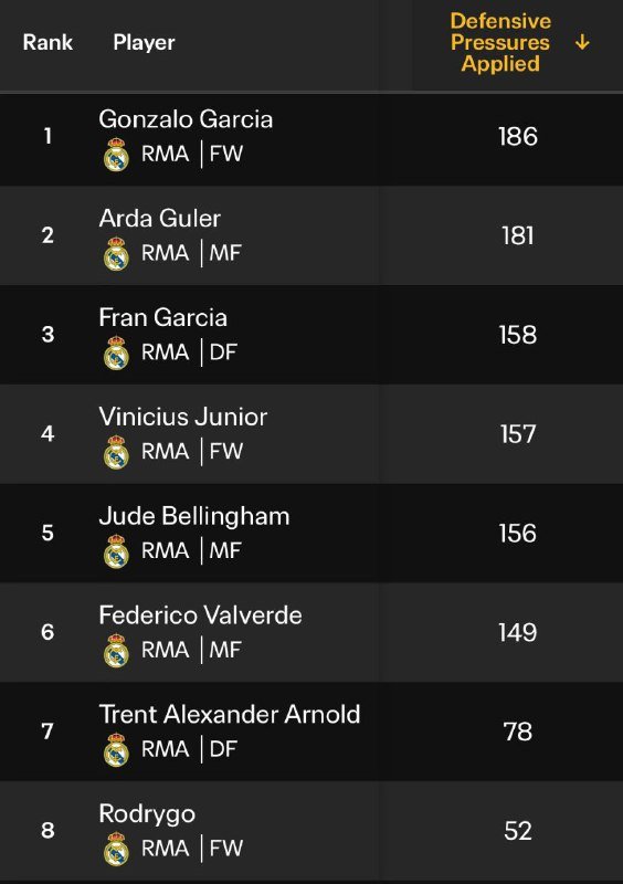 🚨🚨📊 • أكثر عمليات الضغط الدفاعية التي مارسها لاعبو ريال مدريد خلال بطولة كأس العالم للأندية.🤩– غونزالو غارسيا [186]. 🤩– آردا غولر [181]. 🤩– فران غارسيا [158].🤩– فينيسيوس جونيور [157].🤩– جود بيلينغهام [156]. تصفّح المقالات تيبو كورتوا: “أخبرت ديمبيلي بعد المباراة أنه كان يضغط كثيرا وبشكل جيد جدًا”…عـــاجـــل – ديفيد أورنستين |توتنهام هوتسبير يوجه اهتمامه نحو لاعب خط وسط نوتنغ…