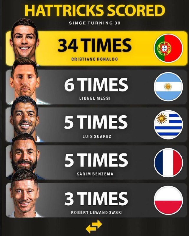 – أكثر 5 لاعبين تسجيلاً للهاتريك بعد عمر الـ 30 عام.• كريستيانو رونالدو – 34 ….