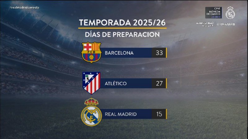 — برشلونة حصل على 33 يوم للاستعداد للّيغا، أتلتيكو مدريد 27 يوم، وريال مدريد 15 يوم فقط.