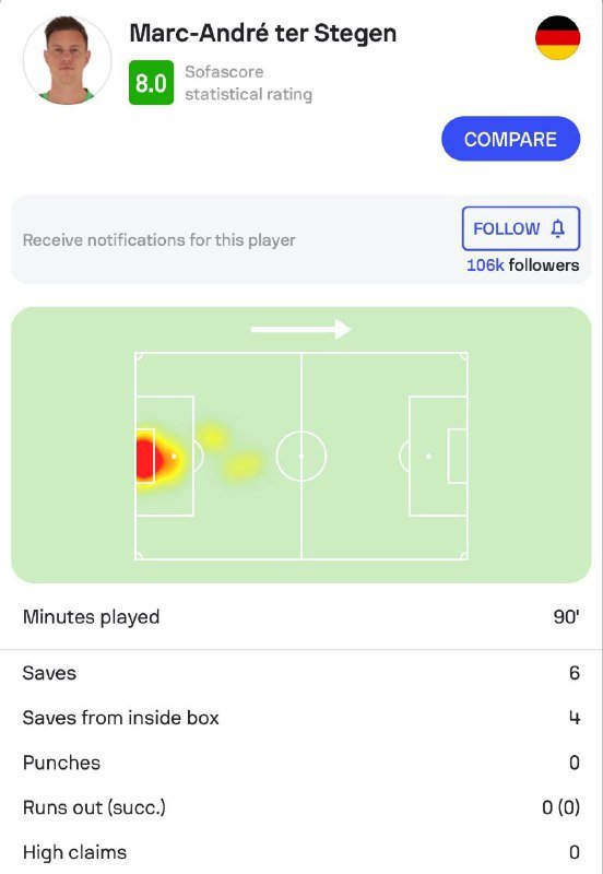 مع ذلك قدم تير شتيغن مباراة كبيرة. 6 تصديات — 4 تصديات داخل المنطقة 🇩🇪. 👏👏👏👏👏👏👏👏👏 تصفّح المقالات رســـمـــيًّـــا |– كيليان مبابي رجل المباراة! …كيليان مبابي خلال آخر (8) مباريات :• 8 مباريات • 14 مساهمة …